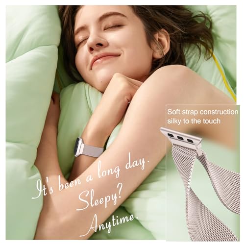 【Breathable & Sweat-proof】The milanese loop for apple watch adopts stainless steel breathable weaving process, presenting elegant luster and texture. The mesh is breathable, making the band elegant and lightweight and incredibly comfortable. It won’t catch arm hairs or rub skin with the unique polished edges and won’t accumulate sweat, making it waterproof and dustproof. Suitable for business, sport, party, travel, casual and other occasions