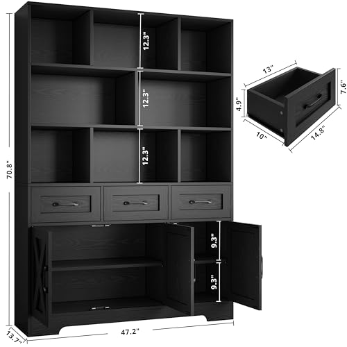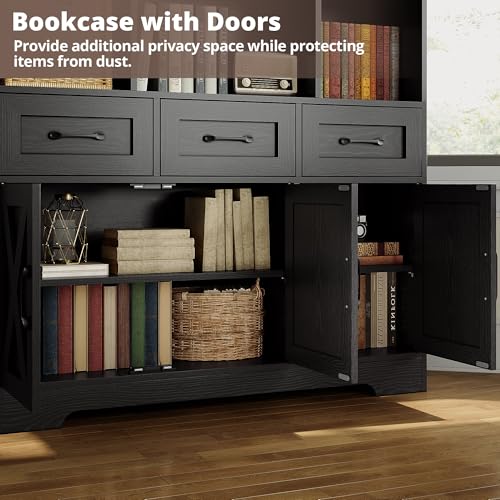 Bookcase with Doors: Having both open and private spaces can meet different storage needs. The 3 farmhouse style doors and metal handles are suitable perfectly with any room decoration, whether placed in the living room, bedroom, or home office.