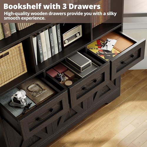 IRONCK Bookshelf with Drawers & Doors, Tall Bookshelf with Storage, Bookcase with Cabinets for Living Room, Bedroom, Home Office, Black