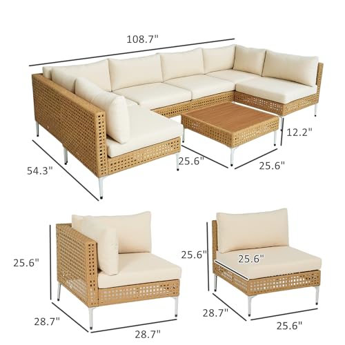 Outsunny 7 Piece Wicker Patio Furniture Set, Modular Outdoor Sectional with Thickened Cushions, Rattan Outdoor Furniture Conversation Set with Slatted Acacia Wood Table for Backyard, Khaki/Beige