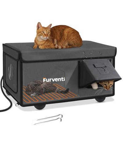 Outdoor Heated Cat House in Winter,Extremely Insulated & Weatherproof,Feral Cat Shelter with Waterproof Eaves & Escape Door for Outside Stray Barn Cat(Dark Grey,25.6″x16.5″x13.4″)